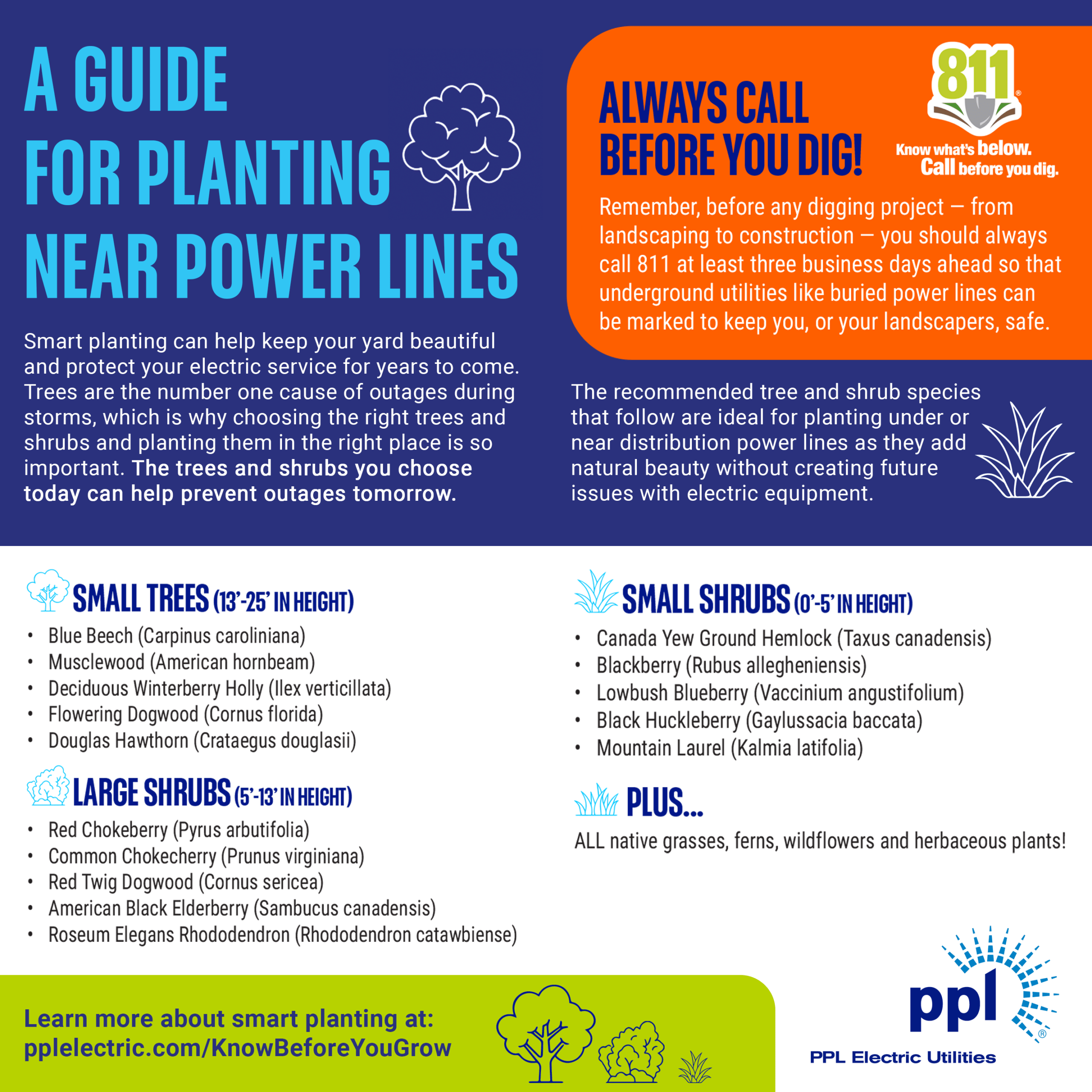 To make planning easier, we offer a list of trees and shrubs that can be safely planted near power lines. It includes options of all sizes — from beautiful flowering trees like Dogwoods and Eastern Redbuds, to larger shrubs such as Black Elderberry and American Witch-Hazel, to smaller favorites like Mountain Laurel, Black Huckleberry and even common berry bushes. You can explore the full list and get more tips at pplelectric.com/KnowBeforeYouGrow.